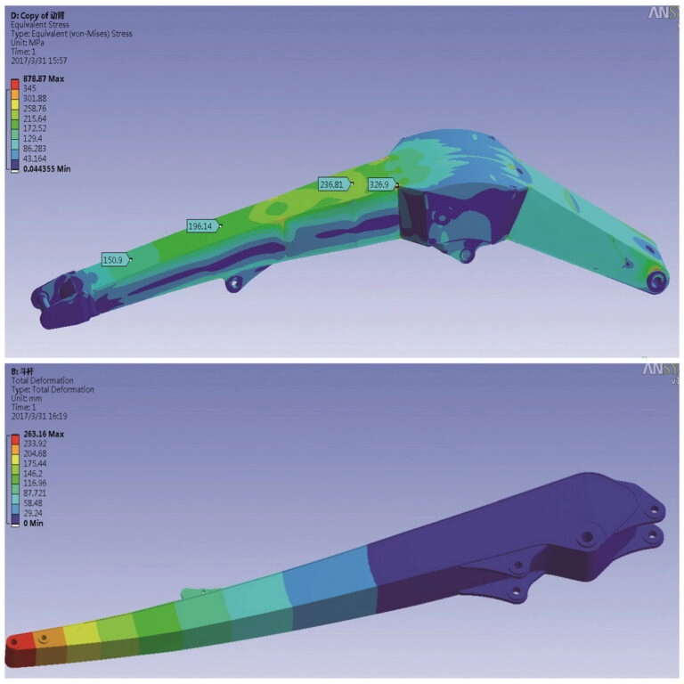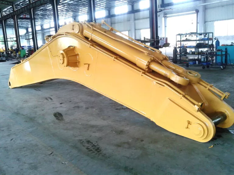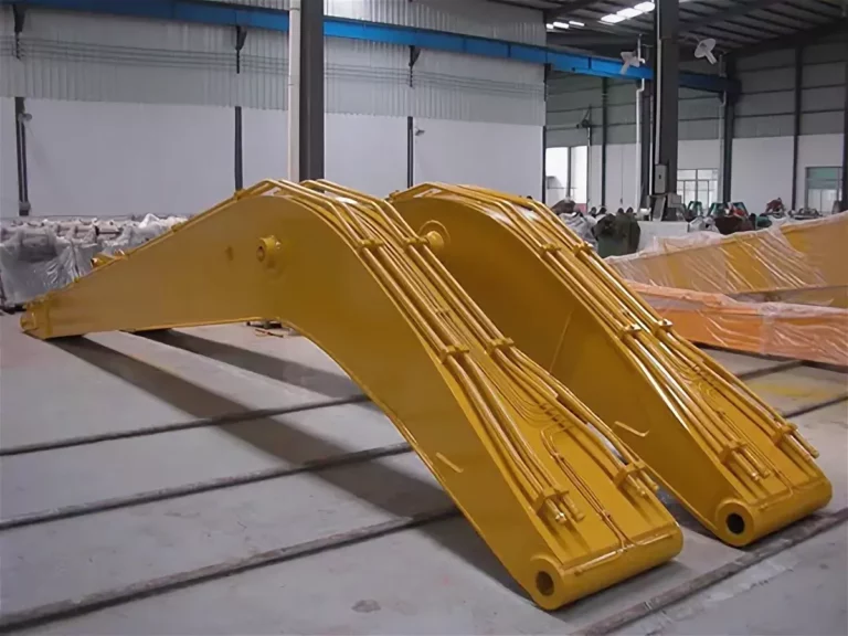 Стандартное экскаваторное оборудование состоит из шарнирно соединенных стрелы, рукояти и ковша, положение которых фиксируется и изменяется гидроцилиндрами, обеспечивающими работу экскаватора. Стрела – коробчатая сварная конструкция, усиленная накладками и ребрами жесткости в местах крепления к раме экскаватора, рукояти и штокам гидроцилиндров. Наиболее распространены моноблочные сварные стрелы, но для расширения рабочей зоны могут использоваться и двухзвенные стрелы, состоящие из двух шарнирно сопряженных балок, соединенных гидроцилиндром. При необходимости значительного увеличения вылета или высоты подъема рабочего органа используются стрелы увеличенной длины. Их применение требует удлиненного гусеничного хода и дополнительных противовесов.